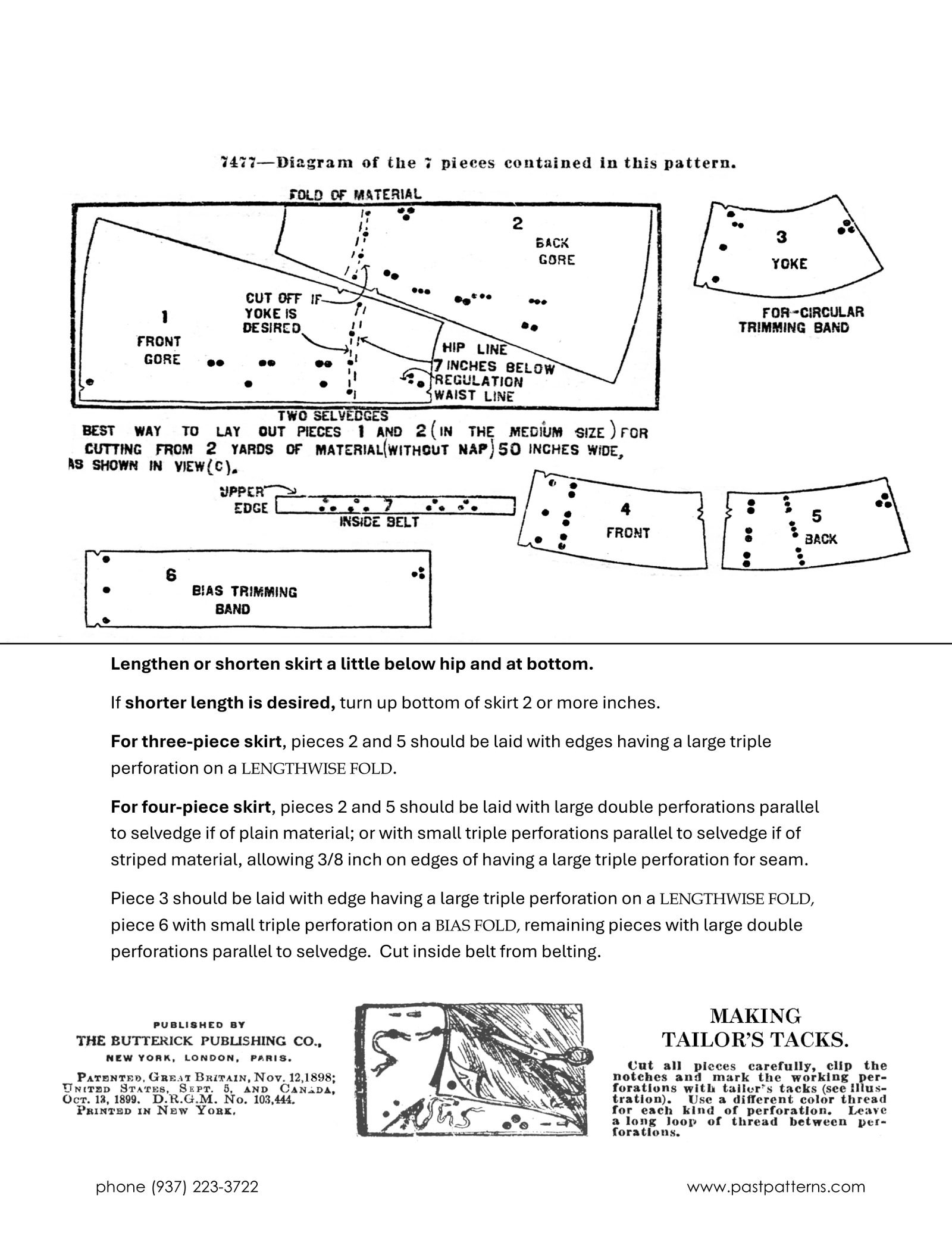 Mid 1910s Three or Four Piece Skirt Downloads reproduce Butterick design 7477 from March 1915, offering three- or four-piece construction with optional yoke and trimming band so the skirt may be worn separately or attached to a bodice.